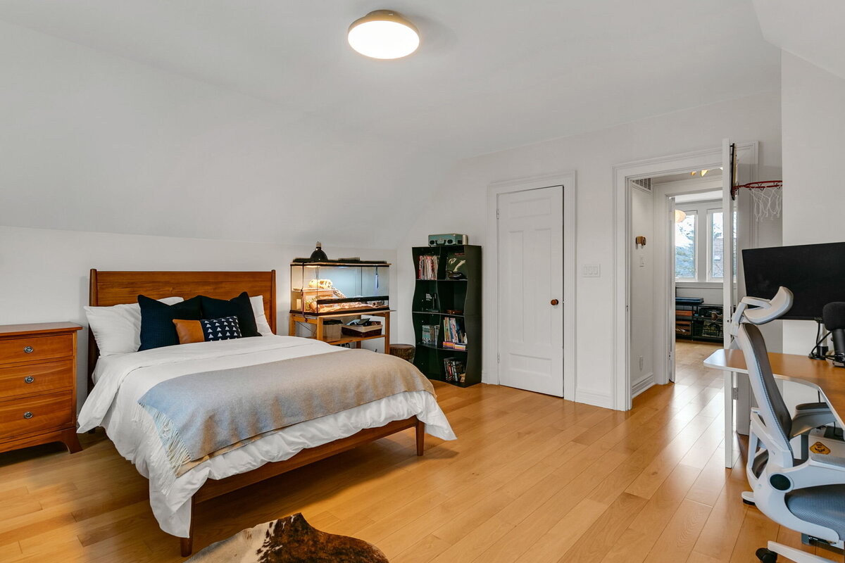 Inside, thoughtful design meets everyday comfort. The main floor features a sun-filled living room with a cozy fireplace and a chef-inspired kitchen by Plant Architects, complete with marble countertops, stainless steel appliances, and a built-in desk—opening onto a professionally landscaped backyard with a custom wired shed. Upstairs, five spacious bedrooms span two levels, including a luxurious 6-piece bathroom with garden views and a full laundry room. The lower level adds even more versatility with radiant in-floor heating, polished concrete floors, a 4-piece bathroom, mudroom, and a bonus space ideal for a gym or office.