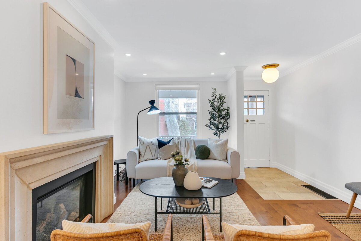 Bright and welcoming, the living room features a large window and fireplace, flowing seamlessly into the dining area.