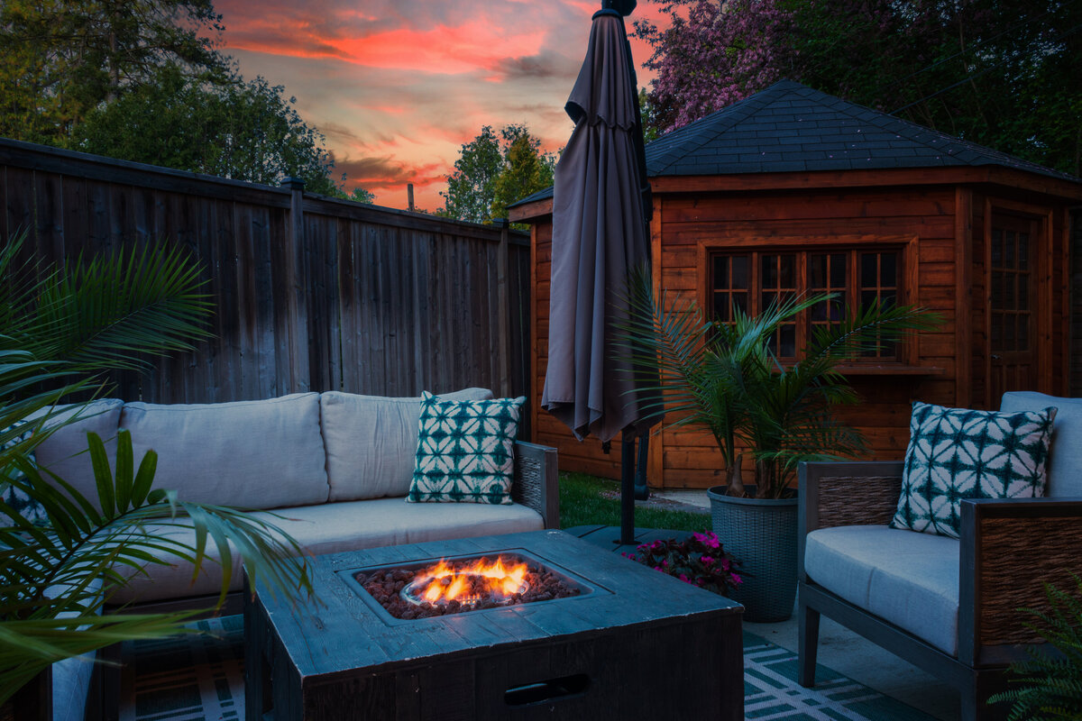 Outside, the backyard is a true oasis, featuring an Arctic Spa hot tub with integrated speakers (2018), a cedar play structure, and a handcrafted Summerwood shed. The EZ Lawn sprinkler system with cedar drip line and RainBird Wifi controller keeps everything green with ease.